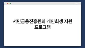 재정적으로 힘든 상황에 처해 본 적이 있으신가요? 이러한 어려움은 누구에게나 찾아올 수 있습니다. 특히, 개인회생은 많은 분들에게 큰 도움이 될 수 있는 제도입니다. 서민금융진흥원의 개인회생 지원 프로그램은 이러한 어려움을 겪고 있는 분들에게 희망의 손길을 내밀고 ...