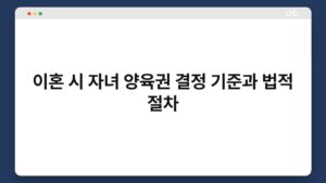 이혼을 고려하는 분들이라면 자녀 양육권에 대한 걱정이 클 것입니다. 이 과정은 감정적으로나 법적으로 복잡할 수 있지만, 올바른 정보를 통해 준비할 수 있습니다. 자녀 양육권 결정 기준과 법적 절차를 이해하면, 보다 나은 결정을 내릴 수 있습니다. ...