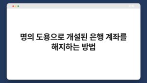 은행 계좌가 명의 도용으로 개설되었다면, 정말 불안한 상황이겠죠? 이런 경우에는 즉각적인 조치가 필요합니다. 이 글에서는 명의 도용으로 개설된 은행 계좌를 해지하는 방법을 단계별로 안내해 드리겠습니다. 이 정보를 통해 불안감을 덜고, 안전한 금융 생활을 이어가시길 바랍니다. ...