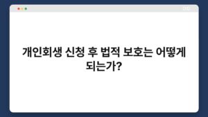 신용 문제로 고민하고 계신가요? 개인회생 신청을 통해 법적 보호를 받을 수 있다는 사실, 알고 계셨나요? 많은 분들이 개인회생을 고려하지만, 그 과정에서 법적 보호가 어떻게 이루어지는지에 대한 궁금증이 큽니다. 이 글에서는 개인회생 신청 후 법적 보호의 ...