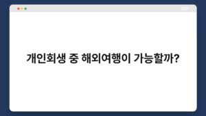 해외여행을 꿈꾸는 많은 분들이 계시죠? 하지만 개인회생 중이라면 이 꿈이 현실로 다가올 수 있을지 고민이 많으실 겁니다. 개인회생 절차는 경제적 회복을 위한 중요한 과정이지만, 해외여행과의 관계는 어떻게 될까요? 오늘은 개인회생 중 해외여행이 가능한지, 그 조건과 ...